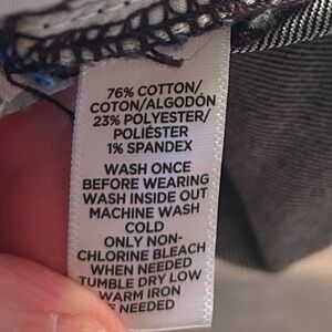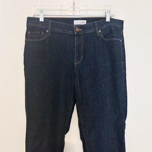 LOFT Modern Straight Jeans in cotton/polyester/spandex; machine wash. Made in Indonesia. Dark wash. Approximate measurements: Waist flat across 17”, Rise 9.5”, Inseam 31.25”. Smoke-free home.