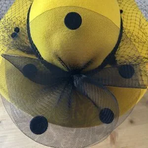 This is the cutest vintage hat ever! 100% yellow wool felt adorned with a mesh face cover, a large mesh bow on the back, and little black polka dots all over. The hat has a shallow crown and elastic chin band to hold it in place. Perfect for costume, theater, special occasions, or hang onto it for the Kentucky Derby. It's in great condition with no damage or notable flaws.