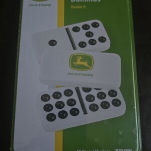 Classic domino set with a John Deere theme. Features green and white colors. Ideal for game nights.