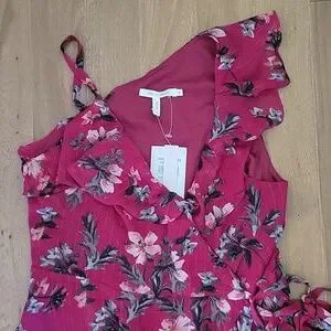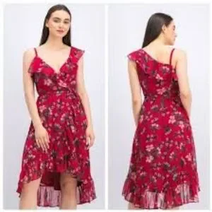 Chic red midi dress with floral pattern. Features ruffled sleeves and hem. Perfect for any occasion.