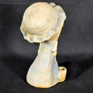 This charming vintage figurine captures a serene, wistful expression, reminiscent of simpler times. Crafted in Japan, this collectible piece features a delicate blue and beige color palette, highlighting the gentle curves of the figure's dress and hat. A subtle addition to any collection, it also functions as a petite bud vase.