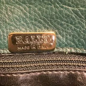 Elegant Bally crossbody bag. Rich green leather with brown accents. Dual front pockets. Adjustable strap.
