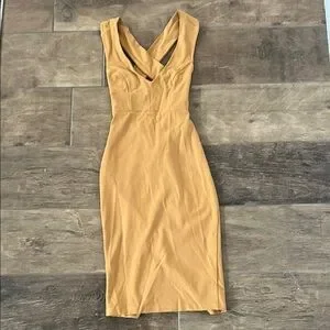Step out in style with this chic mustard midi dress. Its sleek design and vibrant hue make it a must-have for your wardrobe.