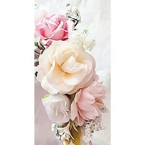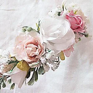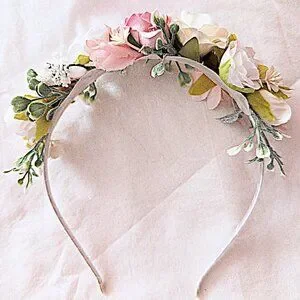 Pink, white and green colored flower crown headdress. It has a mixture of roses, little berries and buds.