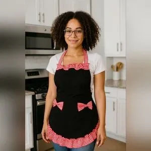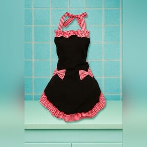 Add some vintage flair to your kitchen style with this adorable retro-inspired apron! Featuring a classic black base with vibrant red-and-white gingham accents, this flirty piece is both functional and fabulous. Whether you're baking, cooking, or hosting, you'll serve looks along with your dishes! ๐