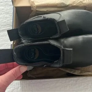 Elevate your style with these sleek black ankle boots. Perfect for any occasion, these boots offer both comfort and elegance. Tuff sole provides extra grip.