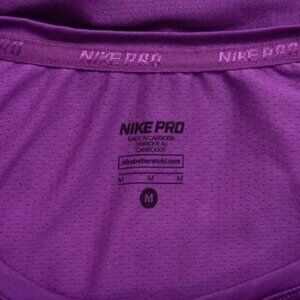Stay cool and comfortable during your workout with this Nike Pro Dri Fit athletic top The top is made of a moisture wicking fabric that helps keep you dry and comfortable during intense exercise The top features a purple color with Nike logo on the front The top has short sleeves and a slim fit design that makes it perfect for layering or wearing on its own This top is perfect for runners athletes fitness enthusiasts or anyone who is looking for a comfortable and durable top to wear during their workouts