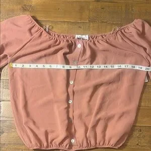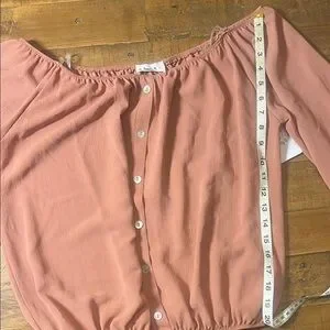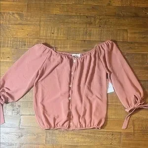 Chic and stylish off-shoulder top with faux button-up front. Perfect for casual outings. Features a beautiful pink color. Size is XL but fits like a medium.
