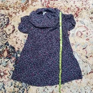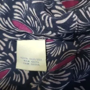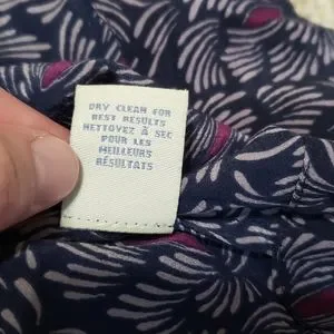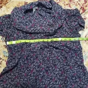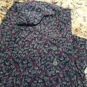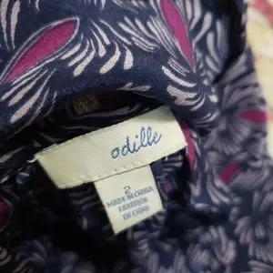 Odille from Anthropologie, this Deuxhill Blouse features a navy and multi-colored print on a billowy silk weave with a buttoned cowl neckline, short cap sleeves and a longer length. 100% silk. Unlined. Size 2.