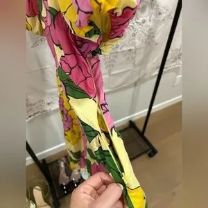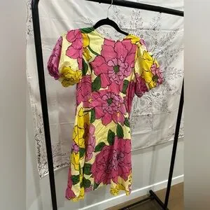 Charming dress with bold floral pattern. Features pink and yellow hues with green accents. The colors and print are stunning and you will get so many compliments. Can dress up or down. Worn once.