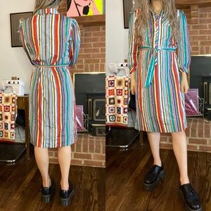 Vintage 80s Leslie Fay Rainbow Vertical Stripe Button Shirtdress Below K…