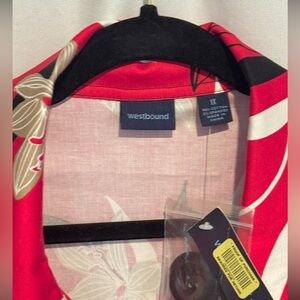 This NWT Westbound Women's Jacket in red with black jumbo buttons is a stylish and comfortable addition to your wardrobe. Made from a cotton blend with a floral pattern, this plus size 1X jacket features a collared neckline, 3/4 sleeves, and a mid-length cut. Perfect for casual or business occasions, this lightweight jacket with stretch is ideal for the warmer seasons of summer, fall, and spring.