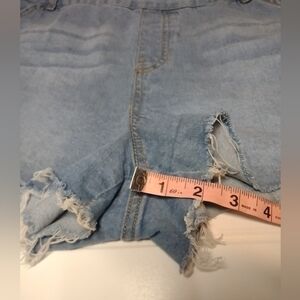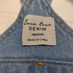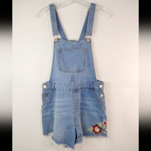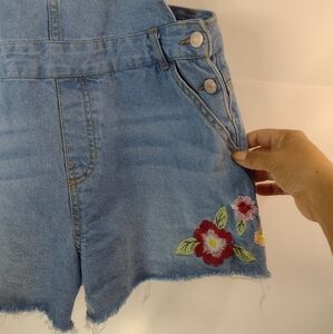 love tree . women's shorts cut off overalls Whit floral embroidery ajustable straps 2 bottoms side Weis closure front and back pockets. 99% cotton 1% spandex. pre-owned