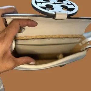 Stylish Tory Burch crossbody with woven texture. Features tan and cream design. Ideal for versatile wear.