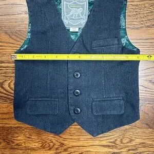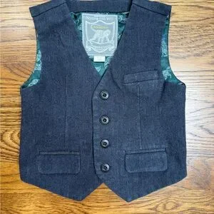 Elegant, classic styling on this navy/ gray vest with a vibrant green fox animal print lining. Features a button-up front and two pockets. Monsoon brand. No holes, stains, or marks. See measurements in photos. Size 18-24 Months.