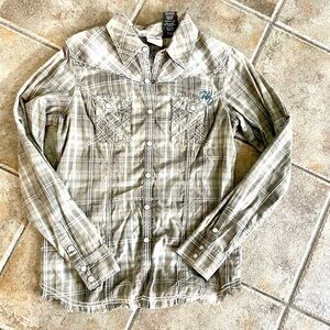 Stylish plaid button-up shirt with embroidered details. Features long sleeves and a classic collar.