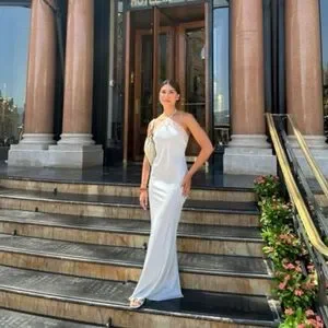 Chic backless design. Halter neckline with lace accents. Perfect for elegant events.