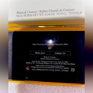 Elegant bronzing palette for a warm contour. Stylish black and gold design packaging. Mirror inside. Comes with makeup bag. Colors are medium toned called 03 Sand & 03 Sol