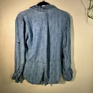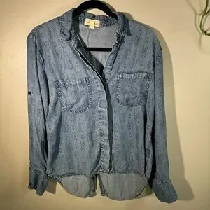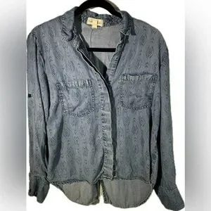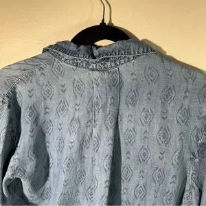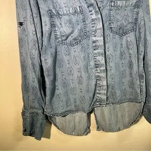 size women small oversize black fit casual lightweight blue denim chambray button down long sleeve top with abstract tribal black print pattern design and great use condition