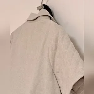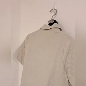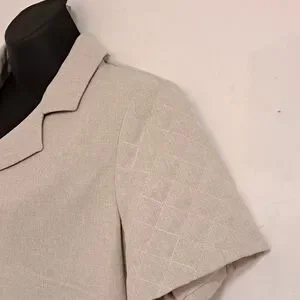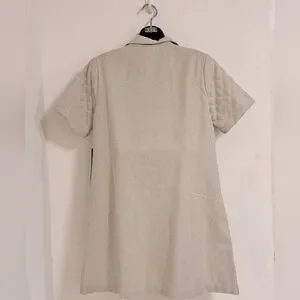 Chic with a classic collar. Perfect for versatile styling. Button down. Quilted pockets and sleeves. Short sleeves. 100% Polyester. Sleeves are lined. Measurements: Shoulder to Shoulder laid flat - 15" , Pit to Pit - 19" , Waist - 30" - 34, Hip - 36" - 38" , Length from center neckline to hem - 24".
