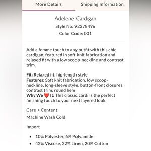 Features: Soft knit fabrication, low scoop-neckline, long-sleeve style, button-front closures, contrast trim, round hem