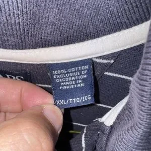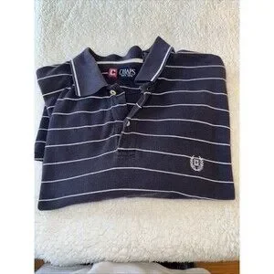 The Chaps by Ralph Lauren Men's 2X Polo Shirt in Blue Striped is a classic and versatile piece of apparel suitable for multiple occasions. Made from 100% cotton knit fabric, this short sleeve shirt features a collared neckline with a button-down style closure and embroidered logo accents. With a regular fit and all-season features, this polo is perfect for casual outings, business settings, or even golfing. The dark blue striped pattern adds a sporty touch to the timeless design, making it a staple addition to any man's wardrobe. Minor flaws in pictures
