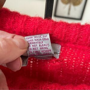 Vintage 80s Rafael novelty sweater featuring felted appliqué and embroidered old fashioned biplane airplane and flowers in a tunic length sweater made of shaggy acrylic mohair. Shoulder pads. red with violet and black, stripes and teal, pink, blue, purple, yellow and white appliqué and embroidery. No noted flaws. Laying flat measures 29 inches shoulder to hem and 20 inches armpit to armpit