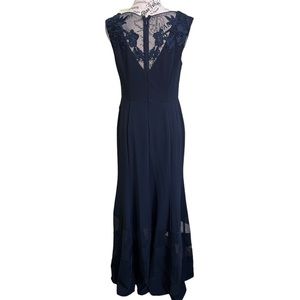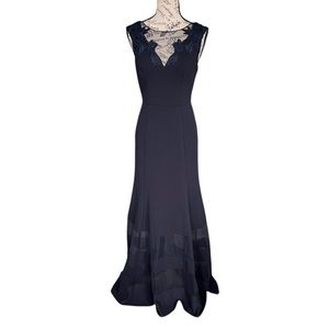 Beautiful Aidan Mattox gown, navy with gorgeous illusion front chest detail and bottom, stretchy fabric, sleeveless, back zipper, lined, new with tag.