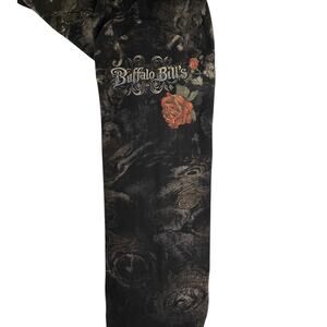 Rhinstone cowgirl on the front with roses throughout. Buffalo Bill on both long sleeves. Size large.