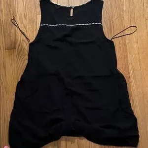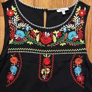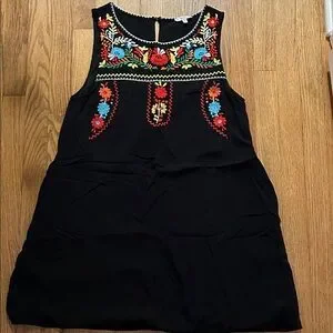 Stylish black mini dress with vibrant floral embroidery. Sleeveless design. Ideal for casual outings.