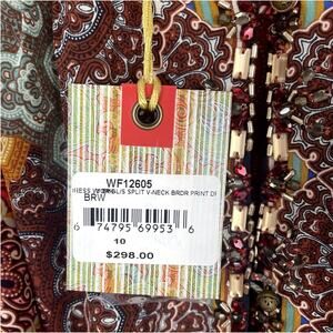 100% silk knee length dress with an allover boho ethnic print. Embellished button front chest. Long sleeves with a button cuff. Waist tie. Absolutely beautiful dress. Size 10
