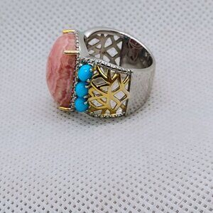 Elegant cocktail ring featuring pink rhodochrosite and turquoise stones with intricate filigree details and gold overlay, perfect for any occasion.