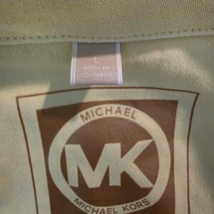 Features a button-front closure, long sleeves with button cuffs, and chest flap pockets with signature MK buttons. In very good pre-owned condition—only one small, almost unnoticeable stain on the sleeve (see photos).