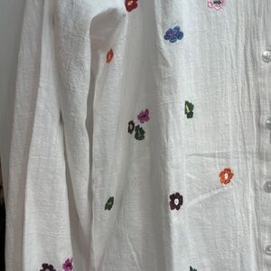 Size Small Easel Los Angeles Embroidered Cotton Gauze Shirt Top in Blush • 3/4 bubble sleeves with cinched cuffs for a soft, feminine touch • Button-down front closure for easy wear • Floral embroidery on the front and back adds unique texture and detail • Relaxed, loose fit for breathable all-day comfort Approximate measurements: • Length: 26” • Bust: 23" across flat, New without tags.