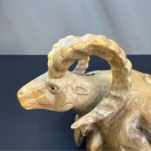 Enhance your space with this exquisite handcrafted vintage hand crafted wooden ram sculpture. Its natural brown finish adds a rustic charm to any decor. This item is in excellent condition please reference pics prior to purchase. Thank you