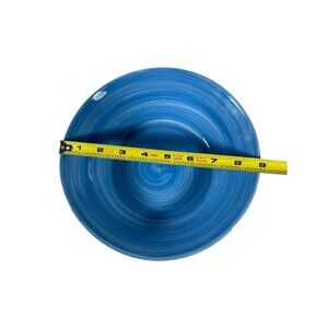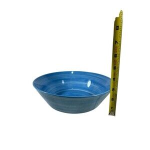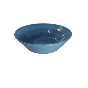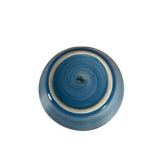 Pre-owned Gibson Everyday Blue Swirl Hand Painted Serving Bowl, measuring 8 7/8" in diameter. This beautifully crafted bowl features a stunning blue swirl design, perfect for serving or display. Shows minor scuff marks and scratches from gentle use, adding to its charming, rustic appeal. Includes a small manufacturer paint imperfection on the rim (small white dot), smooth to the touch, which does not affect functionality. Great condition for its age, ideal for collectors or everyday use