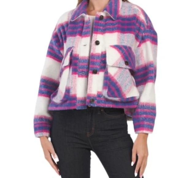 Cozy meets cool in this statement-making plaid shacket. Features a bold pink, purple, and white oversized plaid pattern with a fuzzy, soft-touch texture. Designed with a slightly cropped fit, button front, and flap chest pockets for that trendy, casual vibe.