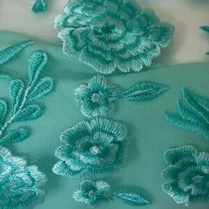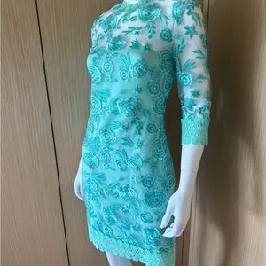 Chic turquoise lace dress with floral design. Perfect for stylish outings.