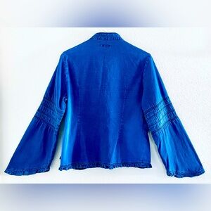 Elegant blue women's jacket with stylish ruffle detail with ruched trumpet sleeve. Versatile worn as a blouse or layer as a jacket!