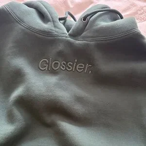Cozy hoodie with subtle Glossier branding. Features drawstring hood. No longer available color forest green, in brand new condition. Worn once, still very fuzzy