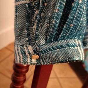 super cute and great used condition has a little tiny sequins and silver thread running through it Chic teal checkered blouse. Stylish and versatile. Ideal for any wardrobe.