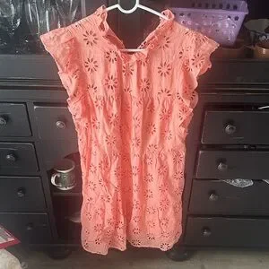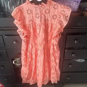 Charming coral maxi dress by Entro. Features eyelet design and ruffled sleeves. Perfect for a sunny day.