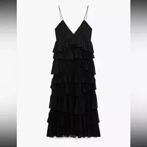 This elegant MIDI black tiered ruffle dress is perfect for any occasion. Its sophisticated design and classic color make it a versatile addition to your wardrobe. WORN ONCE