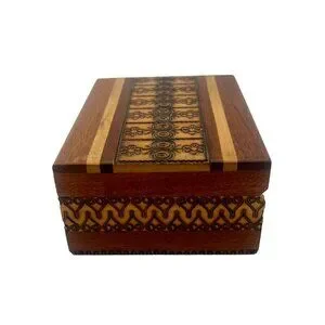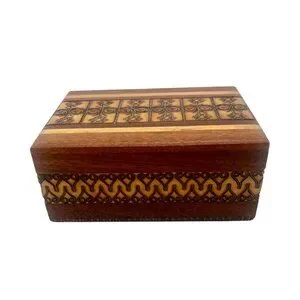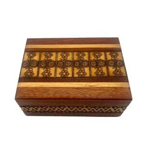This handcrafted vintage wooden box tells a tale of Polish artisanship, showcasing intricate designs burned into its surface. It offers beauty and function, a charming container steeped in tradition.