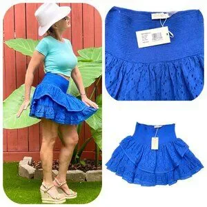 NWT $225 Ramy Brook gorgeous royal blue color Umbra smocked eyelet miniskirt XXS. Will fit XS and S see approx measurements: waist 12" stretch to 17", length 25". 100% cotton, 2 layers of beautiful eyelet and lace fabric.