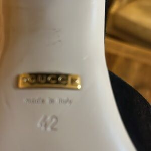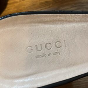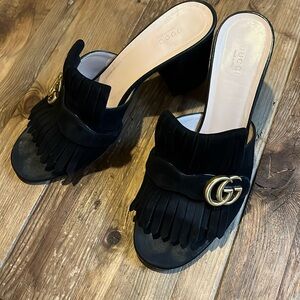 Fringe Slide Sandals. Gold hardware. Leather insole. Some scratches and scuffs on leather sole. Some marks on heel not noticeable when wearing. Great pre owned condition. Size 42/ US 12. 3 1/2” heel