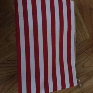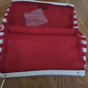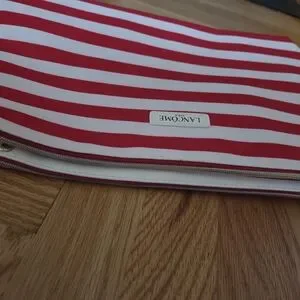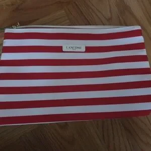 Lancome cosmetic bag. Red and white stripes. Two separate zippered compartments that snap close. Width 12.5", closed length 8", open length 14". New, never used.