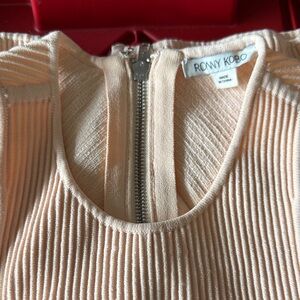 Elegant beige ribbed top with zipper detail. Ideal for versatile styling.