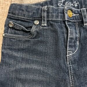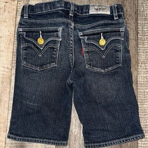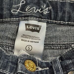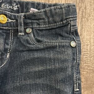 Classic Levi's denim Bermuda shorts for little girl—with distinctive gold button detail with bling jewels throughout. . Ideal for everyday style.size 5- button adjustable waist band. Waistband measurement lying flat is 10.5 inches. 98% cotton 2% spandex.