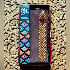 Description: Carry your essentials in Western style with this Red Dirt Hat Co. Rodeo Wallet. Made of genuine leather and suede with a woven design, RFID protection, and a handy exterior pocket for quick access, it’s perfect for rodeo nights or everyday wear. Unisex design